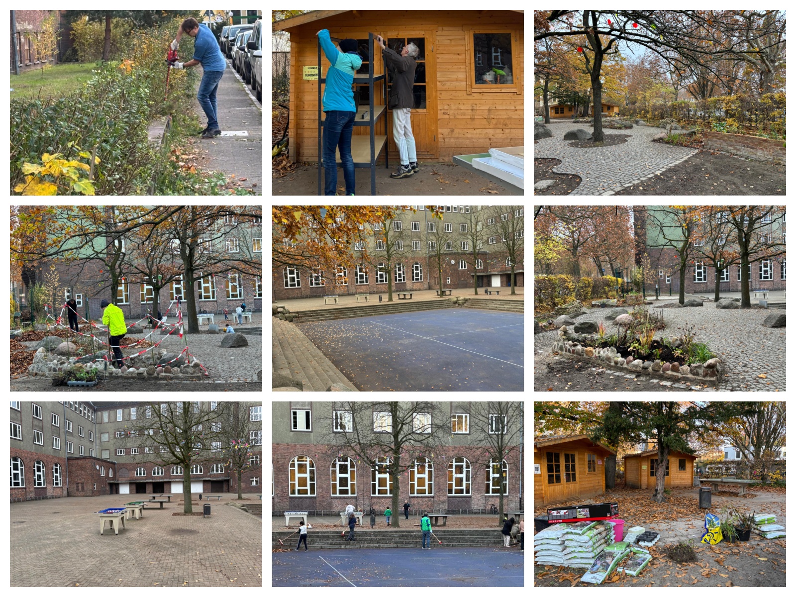 Fast 30 Schüler*innen, Eltern und Lehrkräfte waren dabei, um den Schulhof winterfest zu machen: Hecken wurden geschnitten, Laub gefegt, Regale aufgebaut.