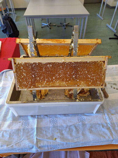 Zuerst haben wir mithilfe der Entdeckelungsgabeln die Rähmchen entdeckelt. Anschließend wurden vier Rähmchen in der Schleuder ausgeschleudert. Dadurch wurde der in den Rähmchen enthaltene Honig durch die Zentrifugalkraft aus den Rähmchen gedrückt und sammelte sich am Boden der Schleuder. Sobald der Honigstand hoch genug war, ließen wir den Honig durch einen Filter in den Honigeimer abfließen. Auf diese Weise konnten wir ca. 20 kg Sommerhonig gewinnen.