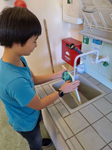 Abbildung 3: Lio spült einen der vier Futtertröge ab (© Jan von Au)