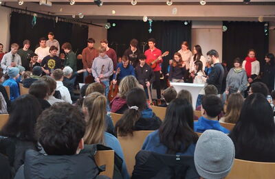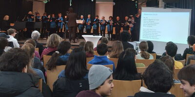 Etwa 200 Schüler*innen von der siebten Klasse bis zur Oberstufe versammelten sich dafür im Mehrzweckraum und lauschten den verschiedensten Erzählungen, Berichten, Liedern und Gedichten. Musikalisch begleitet wurde das Programm vom Shalom Chor Berlin, der die zahlreichen Darbietungen immer wieder mit kurzen hebräischen Liedern ergänzte und Momente des Nachdenkens und In-Sich-Gehens schuf.