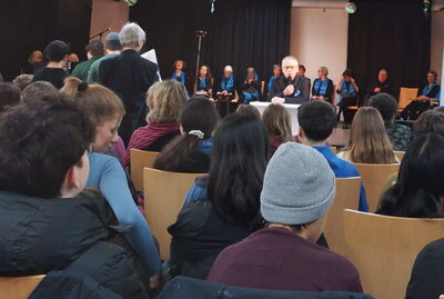 Auch 79 Jahre nach der Befreiung von Auschwitz erleben wir momentan ein Wiedererstarken des Antisemitismus und eine Zunahme antisemitischer Gewalttaten. Im Anschluss an die Gedenkveranstaltung im Mehrzweckraum nahmen zahlreiche Schüler*innen unserer Schule an der bezirklichen Veranstaltung am Theodor-Heuss-Platz teil, um für ein „Nie wieder“ einzustehen.