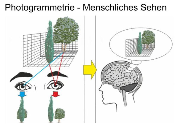 Dr. Strecha eröffnete seinen Vortrag mit einer Einführung in die Photogrammetrie – die Gewinnung exakter Messdaten aus Fotografien. Grundlegend ist ein Prinzip, das jedem vertraut ist: Unser räumliches Sehen entsteht, indem das Gehirn zwei leicht unterschiedliche Blickwinkel zu einem dreidimensionalen Eindruck zusammenführt. Die Photogrammetrie greift dieses Prinzip auf, überträgt es in den technischen Kontext und macht es rechnerisch exakt nutzbar.