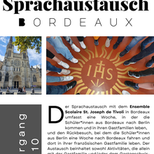 Der Sprachaustausch mit dem Ensemble Scolaire St. Joseph de Tivoli in Bordeauxumfasst eine Woche, in der die Schüler*innen aus Bordeaux nach Berlinkommen und in ihren Gastfamilien leben, und den Rückbesuch, bei dem die Schüler*innen aus Berlin eine Woche nach Bordeaux fahren und dort in ihrer französischen Gastfamilie leben. Der Austausch beinhaltet sowohl Aktivitäten, die allein mit der Gastfamilie und/oder dem Gastgeschwisterkind unternommen werden, also auch gemeinsame Erkundungen mit allen Teilnehmenden.