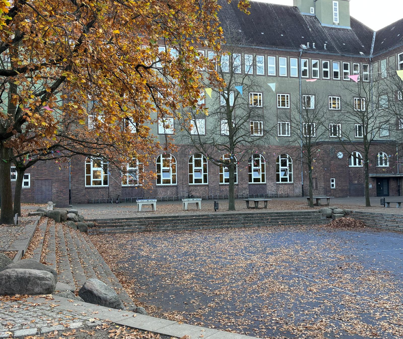 Fast 30 Schüler*innen, Eltern und Lehrkräfte waren dabei, um den Schulhof winterfest zu machen: Hecken wurden geschnitten, Laub gefegt, Regale aufgebaut.