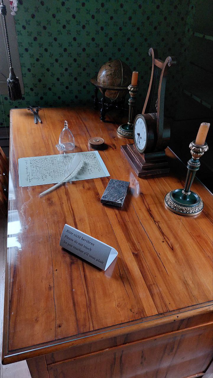 Der erste Tag stand ganz im Zeichen der großen Schriftsteller. Mit einem Umweg über die Bauhaus-Universität, deren Besuch aus zeitlichen Gründen sehr kurz ausfiel und am folgenden Tag wiederholt wurde, ging es zum Goethe-Haus. Vor Ort hörten wir einen kurzen Vortrag zu Goethes Zeit in Weimar, bevor wir, mit Audioguide, durch die Wohnräume des Dichters gingen und so einen Eindruck von dessen Lebensumstände gewinnen konnten. Darauf folgte noch ein Gang durch eine ganze Reihe an Sammlerstücken aus Goethes Besitz. Als nächste Station war das Schiller-Haus geplant. Allerdings hatten wir noch über eine Stunde Zeit bis zu unserem Eintritt, sodass wir kurzfristig das Nationaltheater, in dem die Verfassung der Weimarer Republik beschlossen wurde, besuchten. Nach der Besichtigung der gegenüber gelegenen Ausstellung dazu, die praktischer Weise kein Problem mit spontanen Besuchern hatte, gingen wir zum Schiller-Haus. Auch dort bekamen wir einen Audioguide. Anders als im Goethe- Haus, gab es wenige originale Möbel des Dichters zu bestaunen. Dafür wurde den Werken und der Geschichte Schillers mehr Raum gegeben. Eine besonders interessante Geschichte: Der Schreibtisch sowie weiteres originales Mobiliar waren im zweiten Weltkrieg in das KZ Buchenwald gebracht worden, wo von den Häftlingen Kopien angefertigt werden mussten. Die Duplikate kamen ins Schillerhaus, während die Originale an einen vor Bombenangriffen geschützten Ort gebracht wurden. Nachdem wir diese Ausstellung verlassen hatten, stieß Frau Herzog zur Gruppe und löste Frau Plückhahn ab. Den Rest des Tages konnte jeder für sich gestalten.