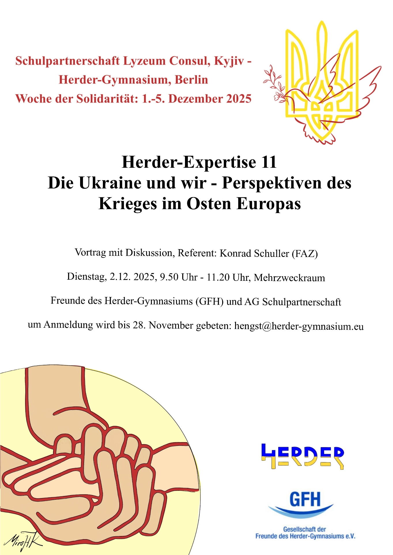 2.12. Herder-Expertise Nr. 11: Die Ukraine und wir - Perspektiven des Krieges im Osten Europas, Referent: Konrad Schuller (FAZ), organisiert vom Förderverein. Um Anmeldung wird gebeten.